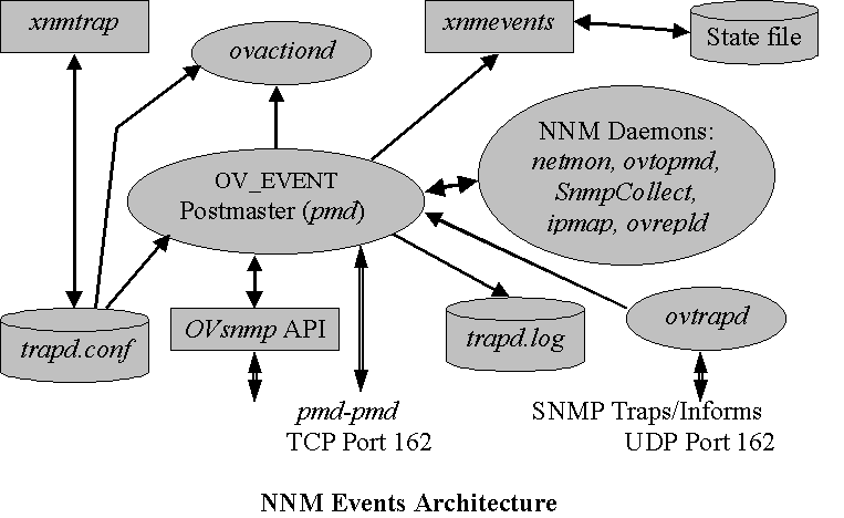 Under NNM, SNMP traps are received at UDP port 162; ovtrapd is the daemon that reads the traps off the socket and, if necessary, provides buffering. The traps are then sent to pmd, the Postmaster daemon. As clearinghouse for events, pmd is responsible for logging events and communicating events to the processes that register with it to receive events of interest.